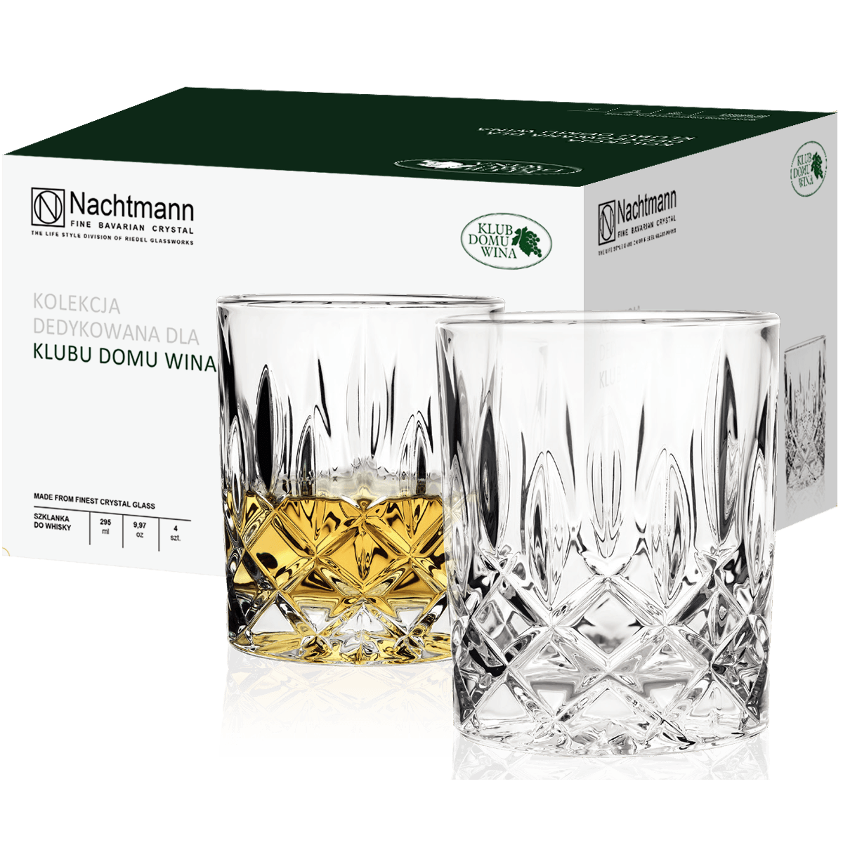 Zestaw 4 klasycznych, kryształowych szklanek do whisky z kolekcji Klubu Domu Wina. Producentem jest uznana niemiecka firma Nachtmann. Szklanki o pojemności 295 ml są wykonane z najwyższej jakości kryształu i ozdobione eleganckim diamentowym szlifem. Odpowiednia grubość dna szklanki, jej ciężar i wyjątkowy design zadowolą z pewnością wielbicieli różnych szlachetnych trunków. A każdemu wnętrzu dodadzą luksusowego blasku.