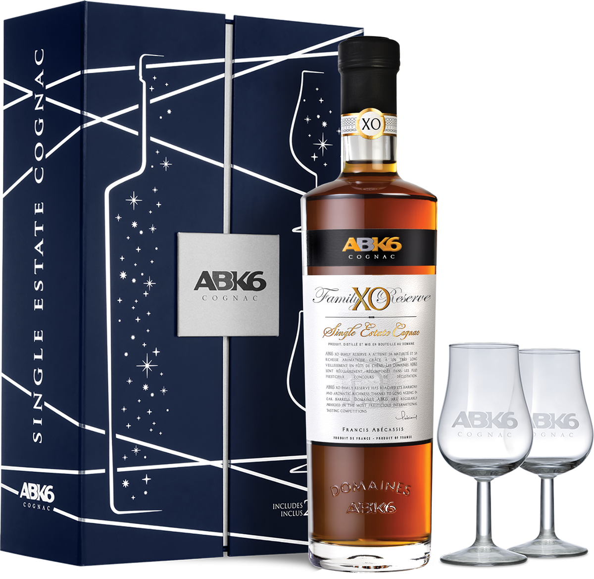 Koniak ABK6 Family Reserve Single Estate w zestawie z dwoma kieliszkami zapakowany w eleganckie pudełko.