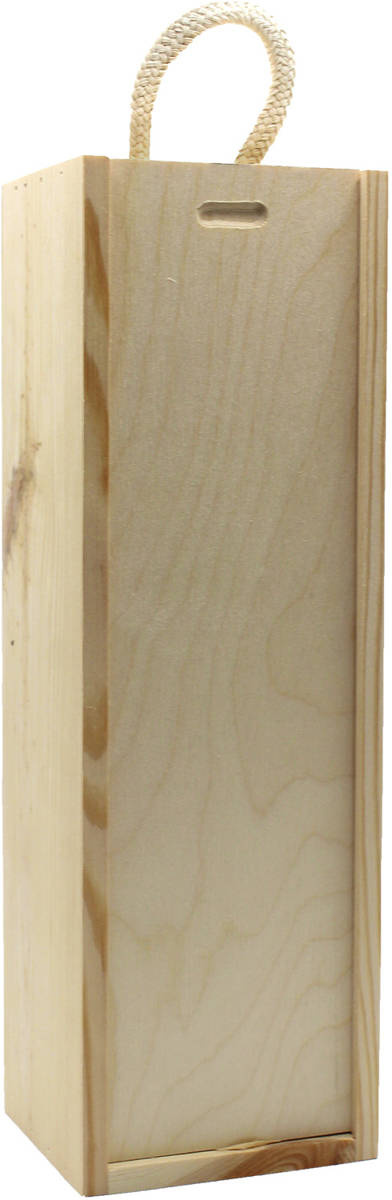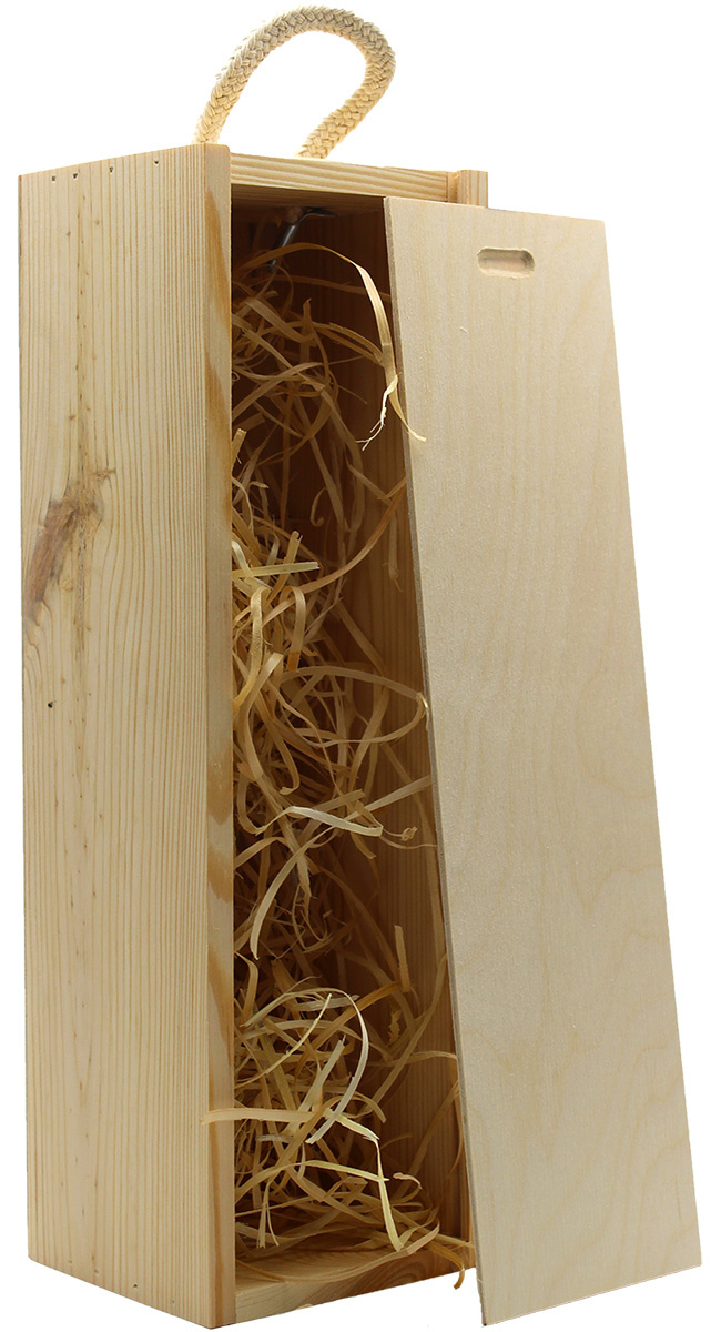 Praktyczna skrzynka z naturalnego drewna przeznaczona na jedną butelkę wina typu Bordeaux. Wyposażona w wysuwaną pokrywę i uchwyt ułatwiający przenoszenie. Wnętrze wypełnione jest wełną drzewną, która chroni butelkę i nadaje całości elegancki wygląd.