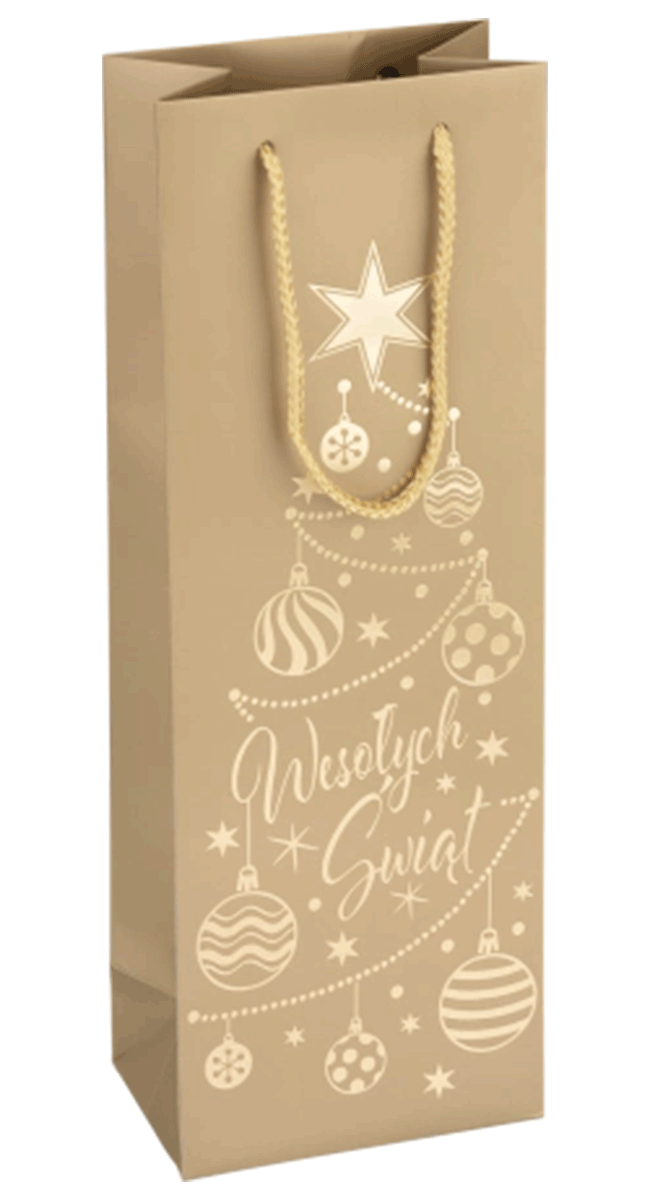 Stylowa złota torba na wino ze złotym nadrukiem, doskonała na świąteczny prezent. Wykonana z solidnego materiału, zapewnia eleganckie i praktyczne opakowanie dla każdej butelki. Jej połyskujący kolor oraz delikatne zdobienia sprawiają, że idealnie wpisuje się w świąteczny charakter, a jednocześnie świetnie sprawdza się przy innych wyjątkowych okazjach.